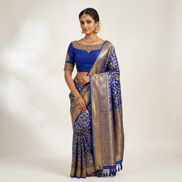 - ❄️ Winter Blouse Choices:Utilize thick velvet, rich brocade, and heavy raw silk. Full sleeves or elbow-length sleeves provide necessary warmth. Embrace deep jewel tones (emerald, burgundy, navy) with heavy zardosi or dense metallic zari work.